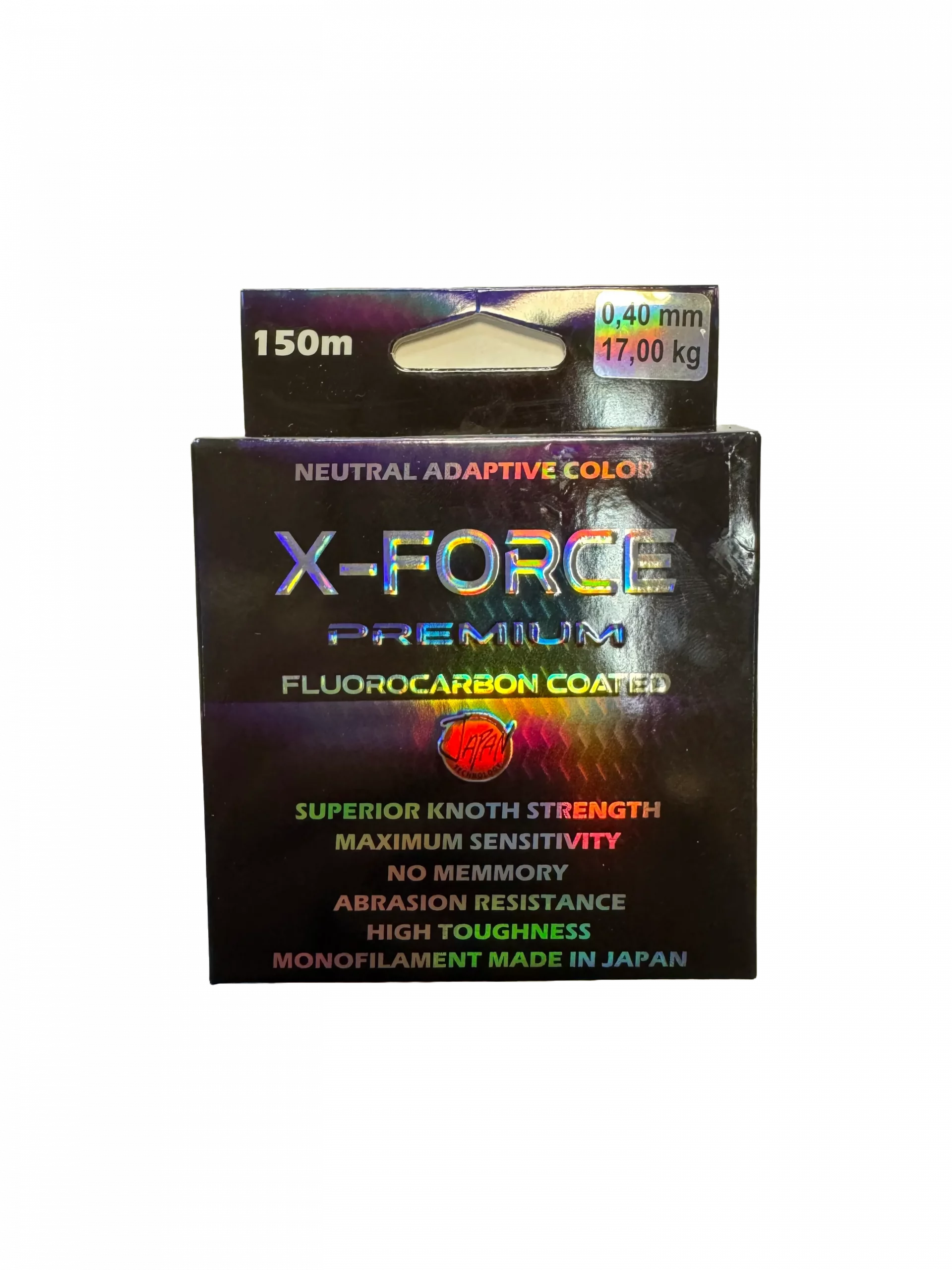 X-Force je premium monofilamentna struna s fluorokarbonskom prevlakom koja objedinjuje najbolje karakteristike najlona i fluorokarbona u jednoj vrhunskoj liniji. Zahvaljujući naprednoj fluorocoated tehnologiji, X-Force postiže gotovo potpunu nevidljivost pod vodom, što je idealno za ribolov u bistroj vodi i situacije kada je riba posebno oprezna. U usporedbi sa standardnim najlonom, ova struna nudi iznimno visoku završnu čvrstoću, što je čini pouzdanim izborom u zahtjevnim uvjetima, među preprekama i grubim strukturama.