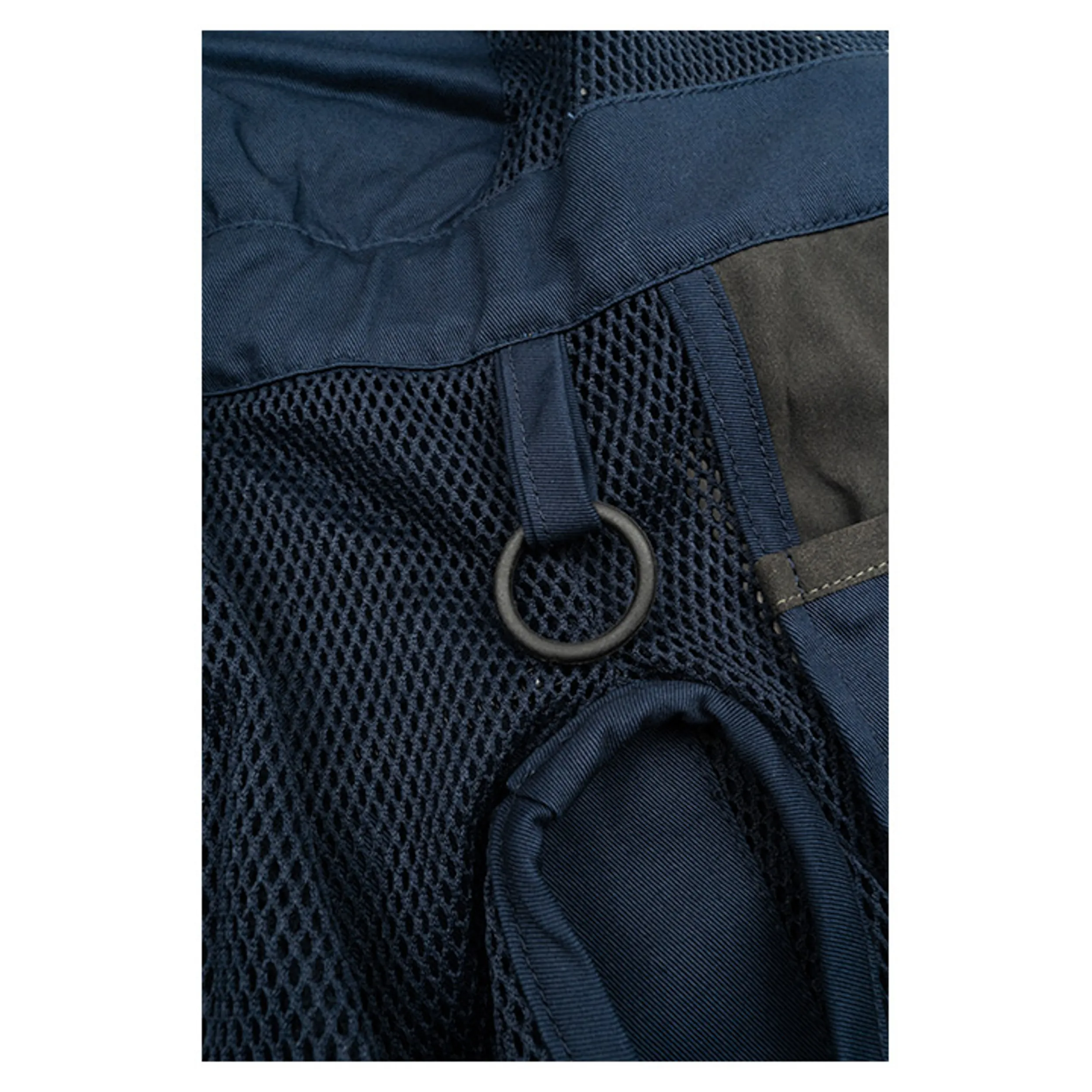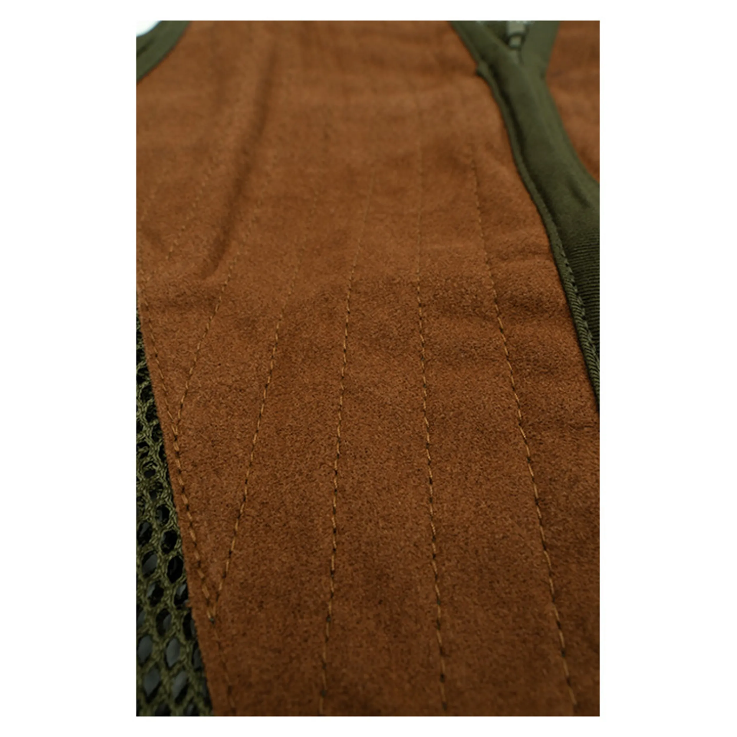Dodatnu praktičnost donose dva O-prstena na bokovima, idealna za pričvršćivanje dodatne opreme poput ručnika ili pribora. Kombinacija robusnih pamučnih obruba i kontrastnih suedette detalja daje prsluku moderan sportski izgled uz zadržavanje klasičnog shooting stila.