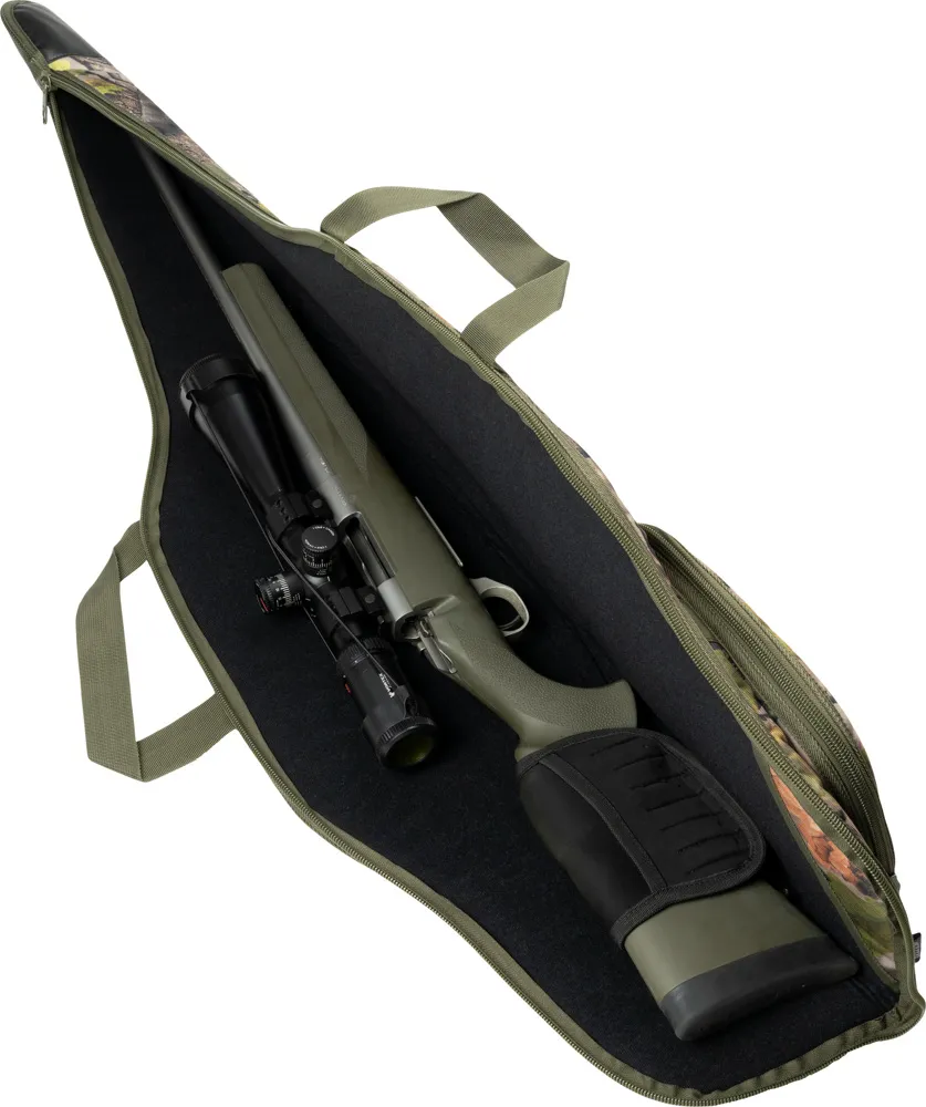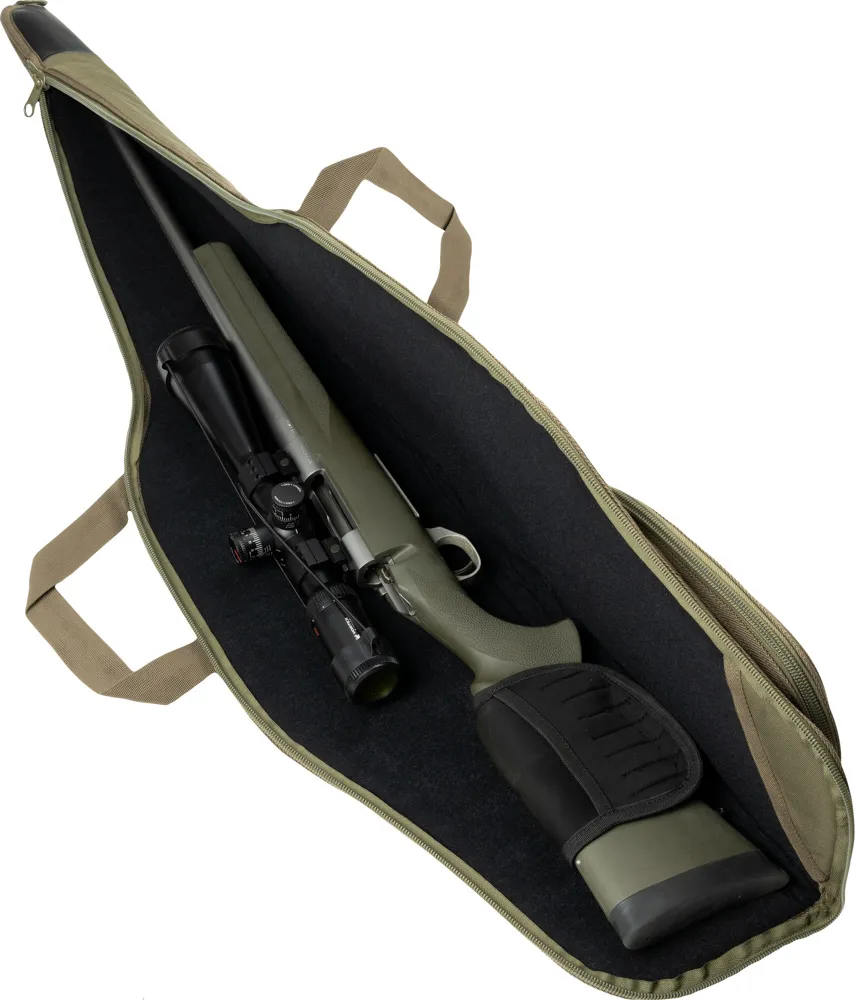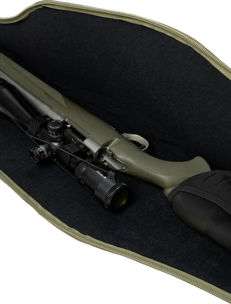 Futrola je dizajnirana s dovoljno prostora za pušku s montiranom optikom, čime se eliminira potreba za dodatnim prilagodbama. Praktičan prednji džep s patentnim zatvaračem omogućuje spremanje dodatne opreme poput metaka, pribora za čišćenje ili dokumenata.